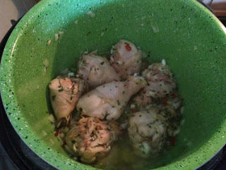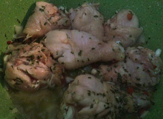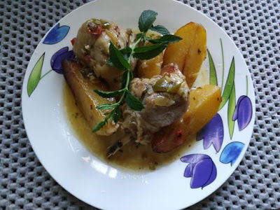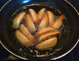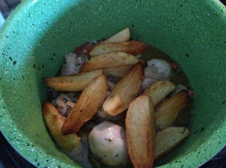 En este punto yo tengo preparadas unas patatas cortadas en gajos que voy a medio freir por fuera solamente como sellandolas. Para luego incorporarlas a la cazuela con el pollo.